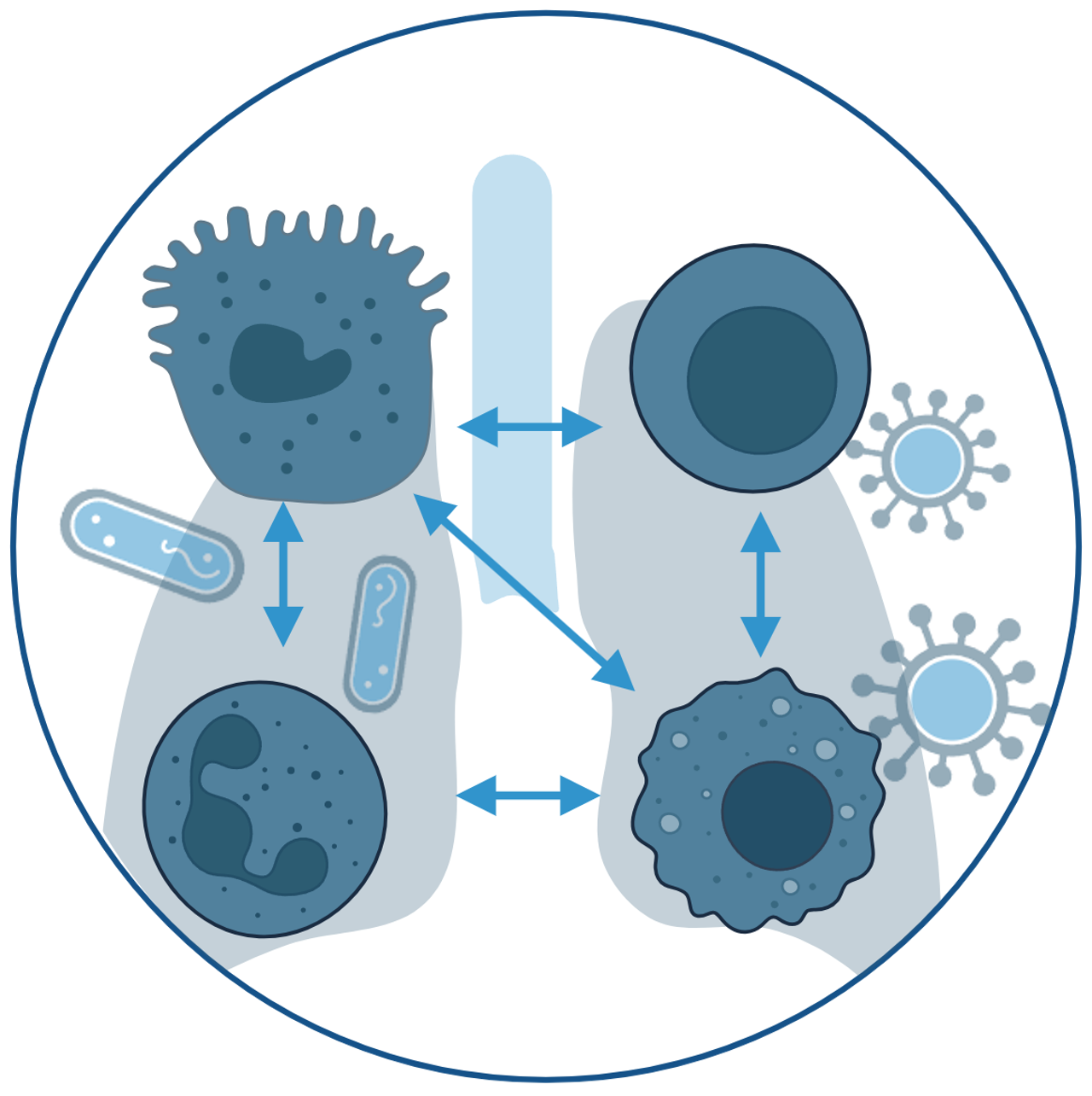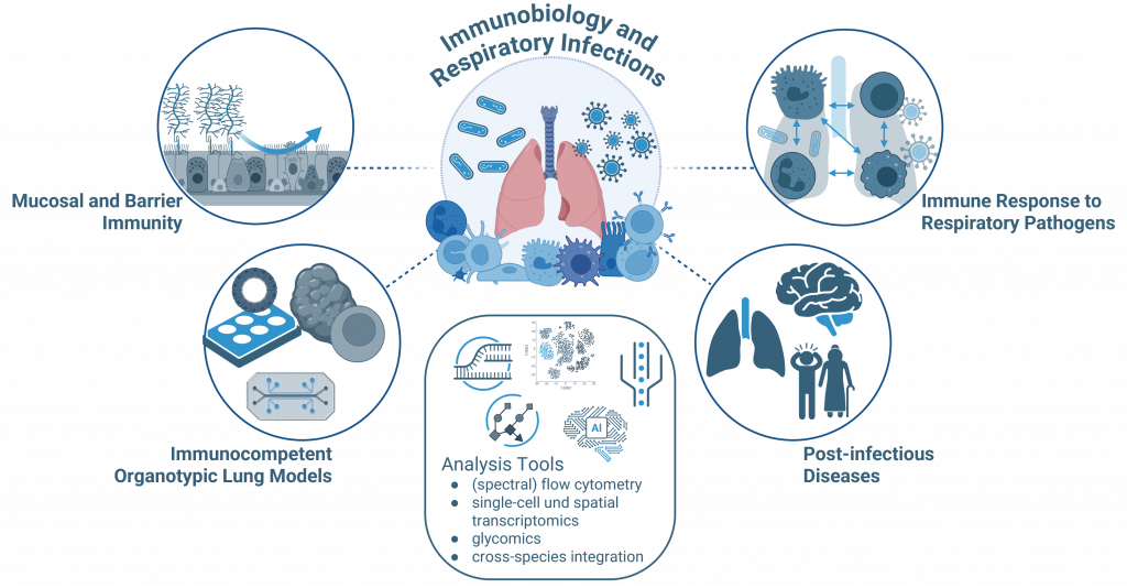 Our research in this area focuses on understanding how the innate and adaptive immune system respond to respiratory pathogens, including bacteria (Streptococcus pneumoniae, Pseudomonas aeruginosa) and viruses (SARS-CoV-2, Influenza A). We investigate the molecular mechanisms and immune cell types that contribute to both protection and pathology during infection.